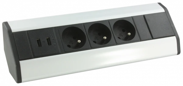 Ce bloc de prises d’angle, de la marque Arlux, permet d’installer un mécanisme d’alimentation sur un mobilier de bureau ou sur un plan de travail de cuisine. Il est doté de 3 socles de prises avec un pôle de phase, de neutre et d’un contact de terre. Ces socles assurent la mise sous tension des appareils électriques comme l’ordinateur, l’écran, l’imprimante, le mixeur, le grille-pain, etc. Ce bloc possède également 2 ports USB pour accueillir les cordons de chargement des appareils mobiles comme le téléphone, la tablette ou la manette de jeux vidéo. Ces prises sont inclinées pour faciliter le branchement et le débranchement des appareils.