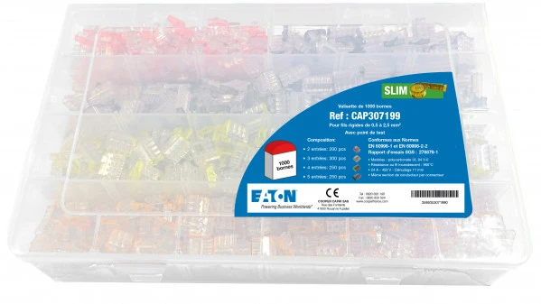 Cette valisette, de la marque Capri, est un ensemble d’accessoires de connexion électrique. Elle contient 1000 connecteurs slim servant au raccordement de fils dans les travaux de branchement et de jonction. Cet ensemble comprend 200 pièces de connecteurs à 2 entrées, 300 unités à 3 entrées et 250 pièces de chaque pour les connecteurs à 4 et 5 entrées. Cette valisette est adaptée pour la jonction des fils dans les travaux de câblages électriques, avec une intensité allant jusqu’à 24 A sur une tension de 450 V. Ces connecteurs sont en mesure de raccorder des conducteurs avec une section allant de 0,5 à 2,5 mm2.